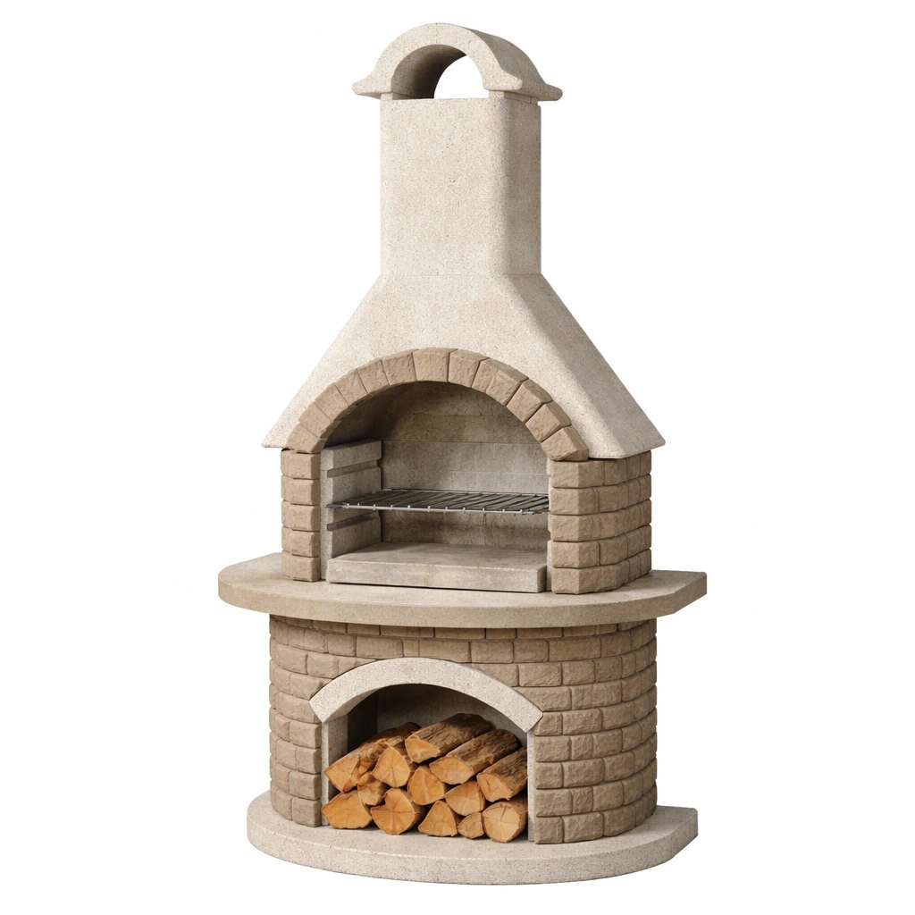 Esta barbacoa para exteriores está diseñada con piedra fundida en la estructura principal, proporcionando durabilidad y resistencia. Incluye una parrilla de acero inoxidable adecuada para cocinar con leña.