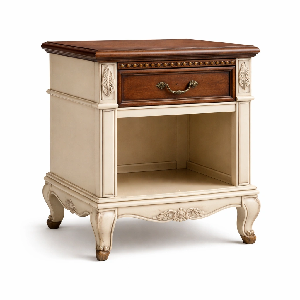 Esta mesita de noche está hecha de madera de abedul maciza con un acabado en laca mate. Presenta un diseño con un cajón y un estante inferior.